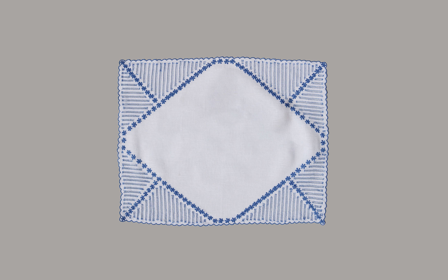 These linen placemats & napkins are framed with scalloped edge embroidery border.