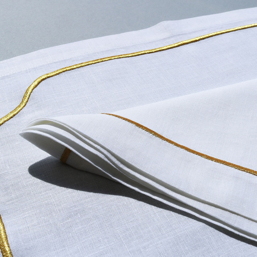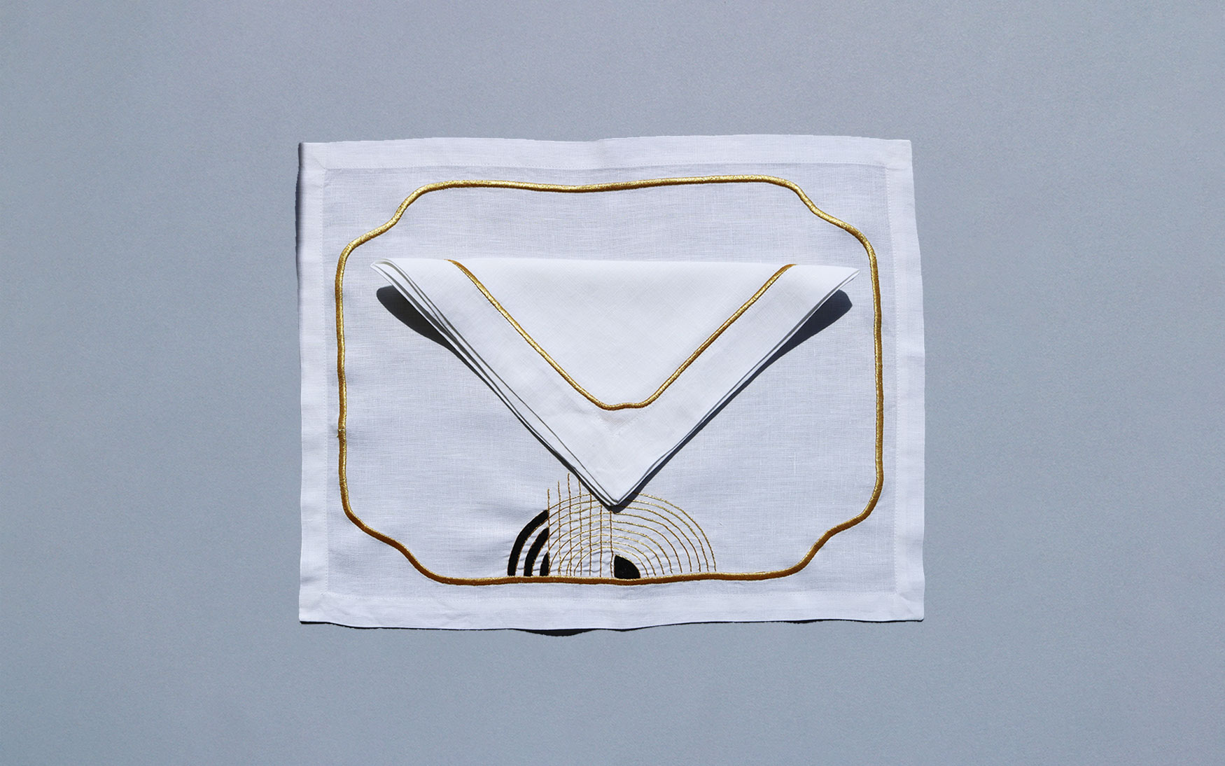 A beautiful gold and black geometric design machine embroidery on white linen with golden line border.