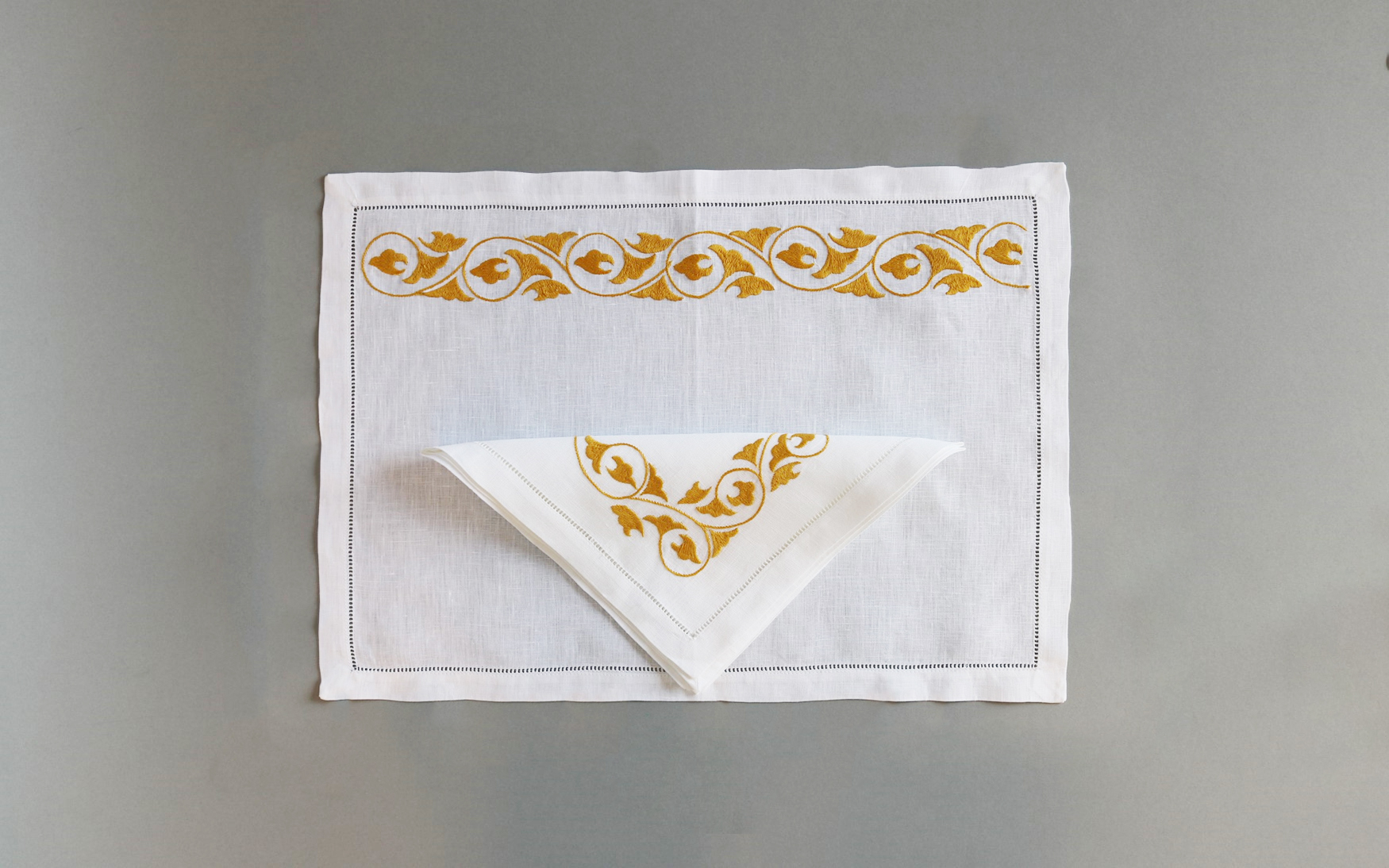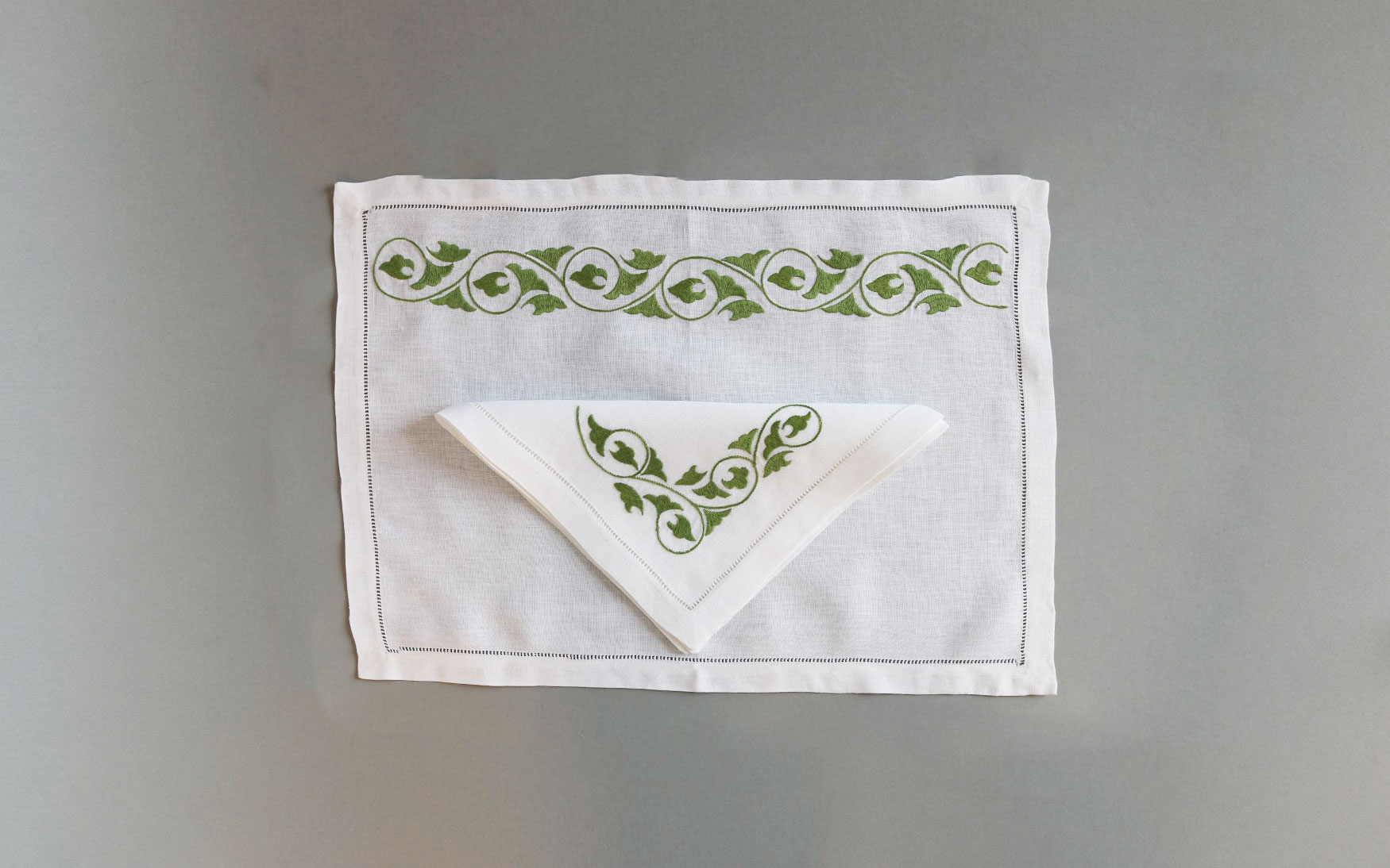A beautiful K5 linen placemat & napkin set is delicately embroidered with flower design on high-quality white linen fabric.