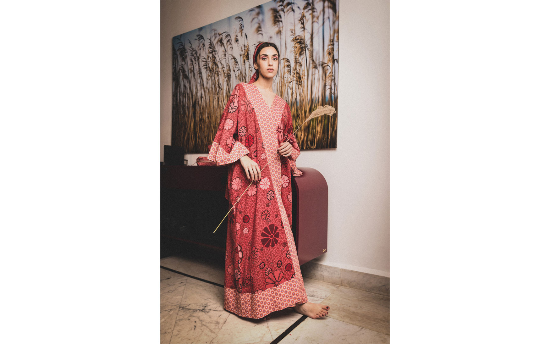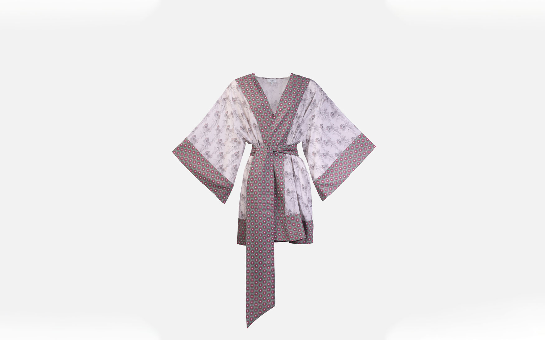 A beautiful free size long printed kimono robe made in pure cotton with a detachable large belt and exaggerated sleeves.