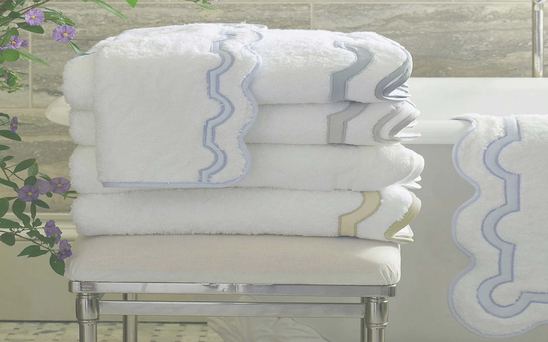 A chic shop awning in Palm Beach inspired the motif that unites our Mirasol collections. For the bath, the border is a stunning Nocturne sateen appliqué on our Cairo cotton terry towels with a scallop piping to finish.