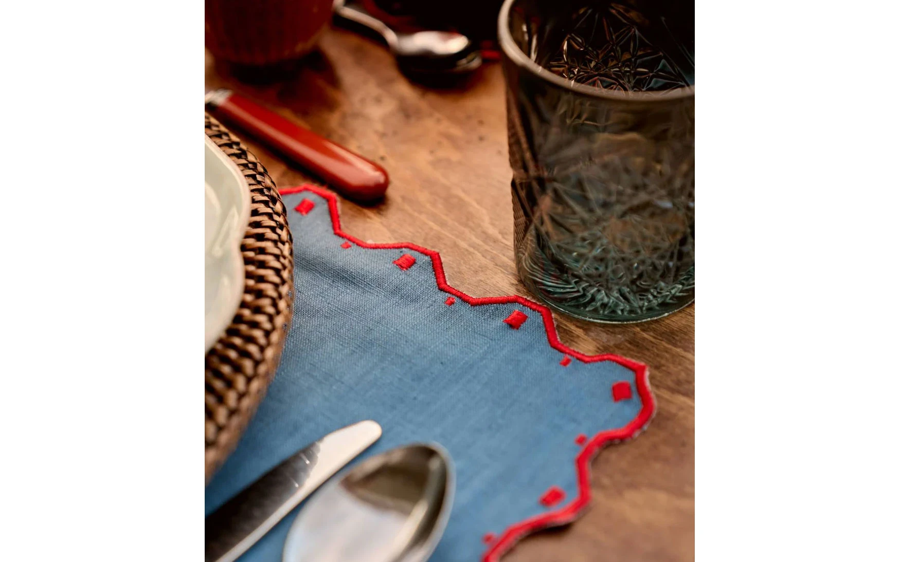This rectangular blue placemat with red embroidered details is a perfect choice to elevate your table decoration during Christmas. With small embroidered squares all around, it brings a festive and sophisticated touch to any meal. Its unique design, with detailed cutouts, creates a warm and elegant atmosphere.
