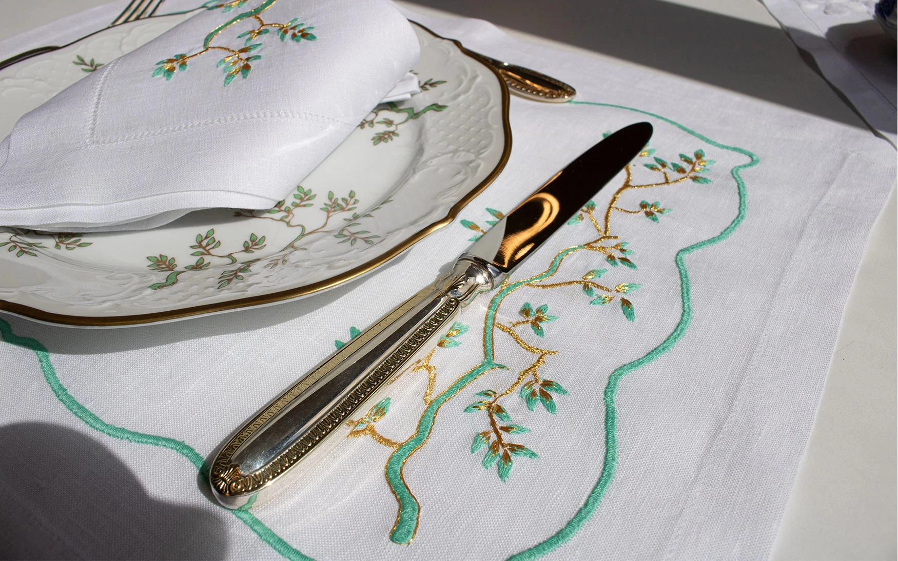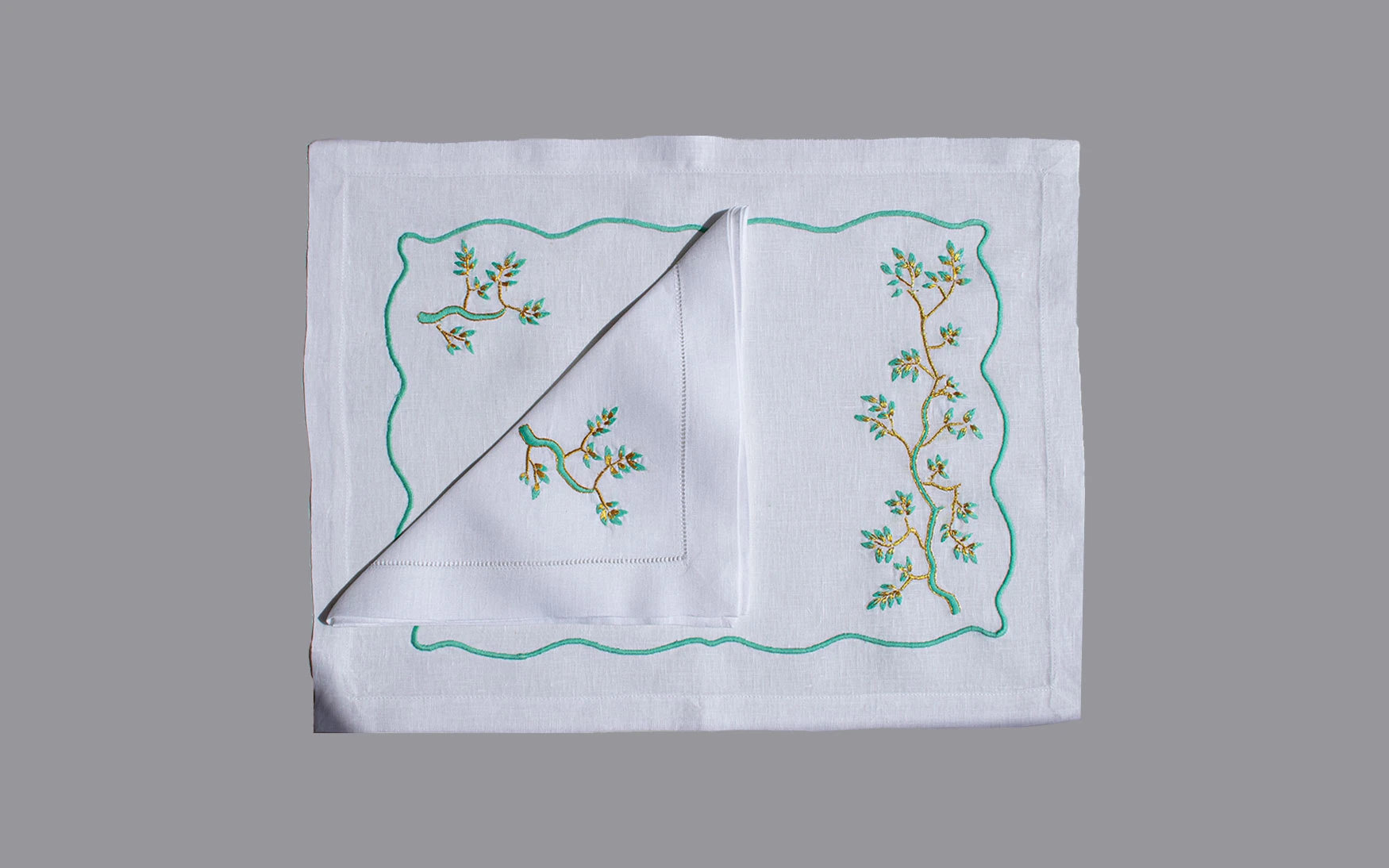 With hand embroidered leaf design in bright green and gold.