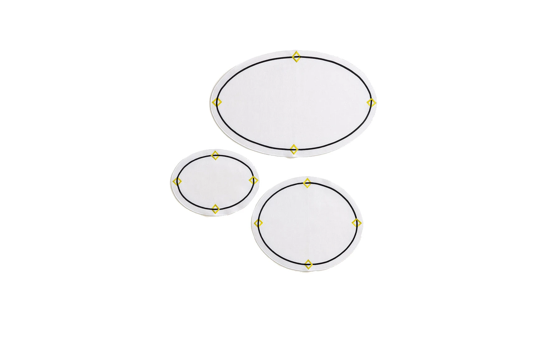 Square design black and gold embroidery on linen.