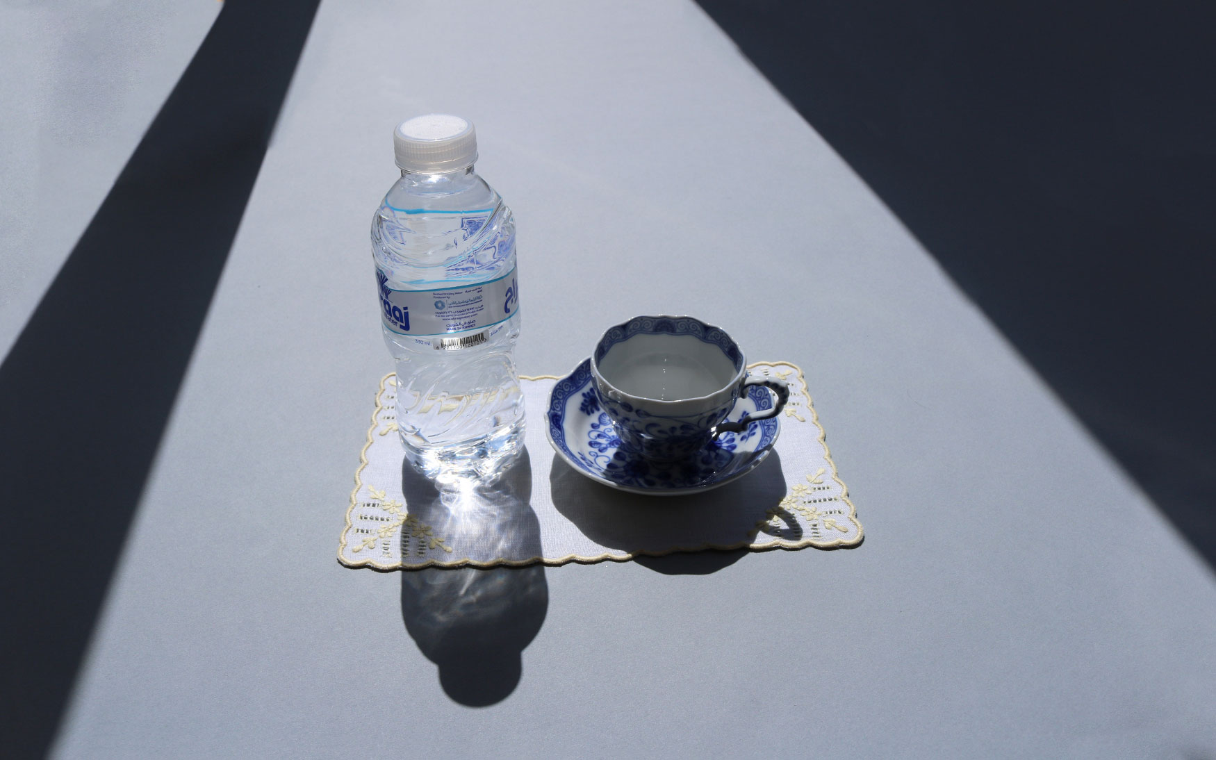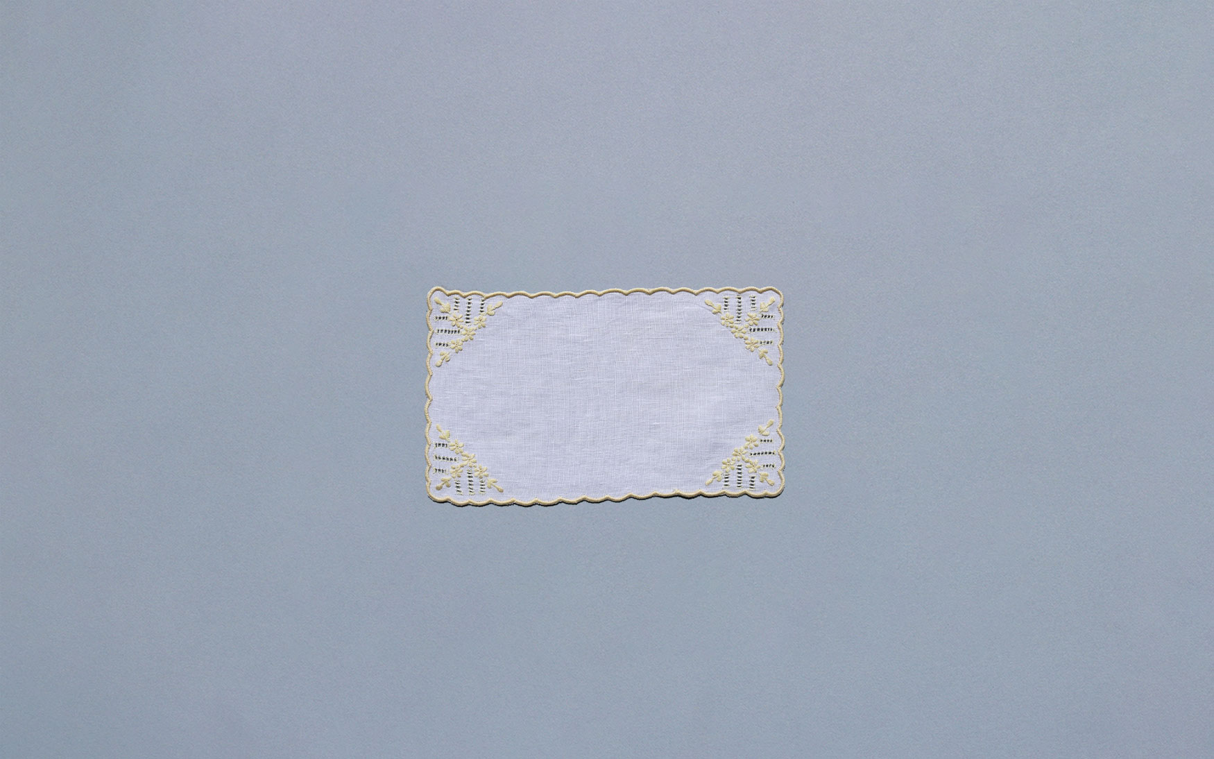 Hand embroidered light yellow color flowers with ajour design on white linen and four side yellow scalloped edging.